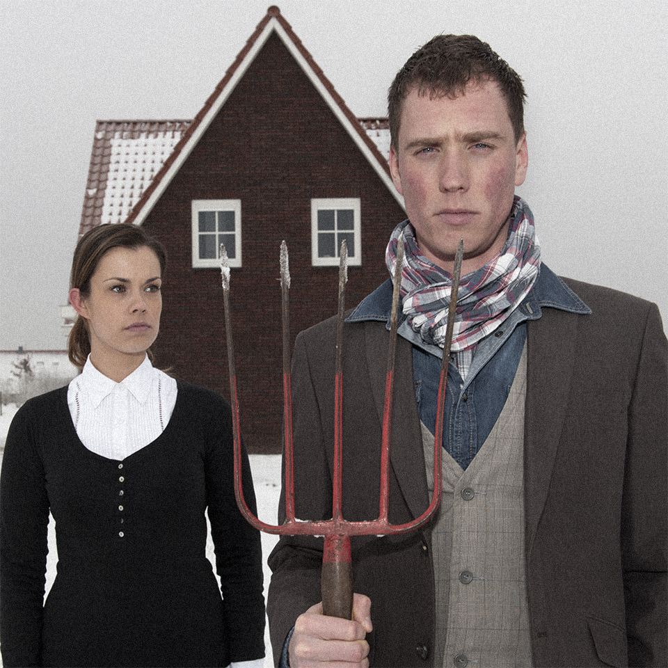 Deze foto is een kopie van het schilderij “American Gothic” van Grant Wood. Ik heb deze foto vorig jaar gemaakt in Hendrik-Ido- Ambacht. Het was een erg koude winterdag met een temperatuur van -20 graden Celsius, dus het was niet comfortabel voor mijn modellen om daar zonder jas te staan. Zoals je kunt zien was er ook nog sneeuw en dat weerspiegelde ook. Ze hebben echt geweldig werk geleverd en zijn echt in hun rol gegaan.