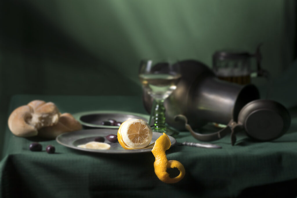 Op de fotografieschool moesten we een Vanitas Still-leven kopiëren (= een soort symbolisch kunstwerk dat vooral wordt geassocieerd met stillevenschilderkunst in Vlaanderen en Nederland in de 16e en 17e eeuwen). Ik koos voor een stilleven van Pieter Claesz en leende alle stukken voor dit stilleven van een antiekwinkel. Ik heb dit stilleven een draai gegeven. Ik maakte deze foto met een technische camera en gebruikte de “Scheimpflug” -techniek met de focus op de citroen. Normaal gesproken is alles in een stilleven goed gefocust; niet zo op deze foto.[