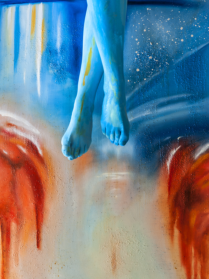 In eerste instantie had ik geen inspiratie. Totdat het idee ontstond om mijn eigen schilderijen als achtergrond te gebruiken. Ik heb toen mezelf beschilderd en dit met mijn eigen schilderijen als achtergrond gefotografeerd. In dit project heb ik het thema bodypainting (uit het ‘GETEKEND‘-project) verder uitgewerkt.