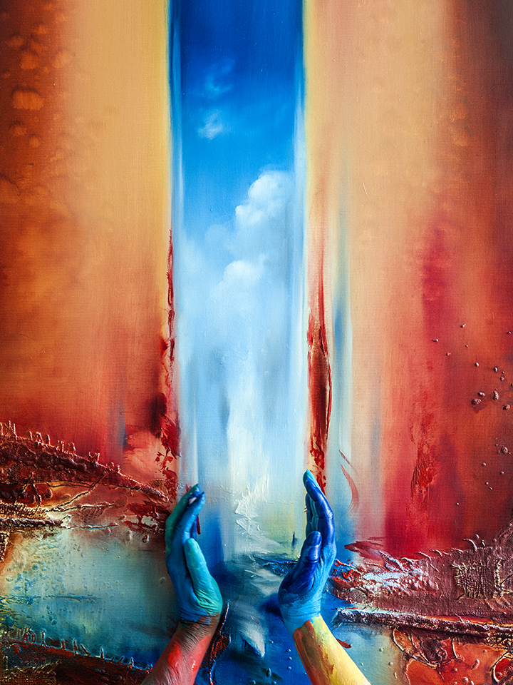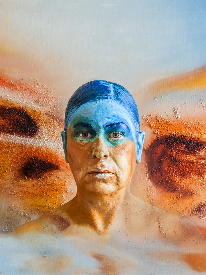 Ik heb mezelf beschilderd in de kleuren van mijn eigen schilderwerk en fotografeerde vervolgens de beschilderde lichaamsdelen met de schilderijen als achtergrond. Dit beeld was zeer verrassend.